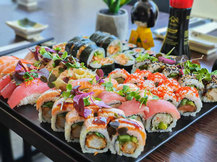 Toppet Uramaki: 8 stk. rainbow, 8 stk. oyisi roll.